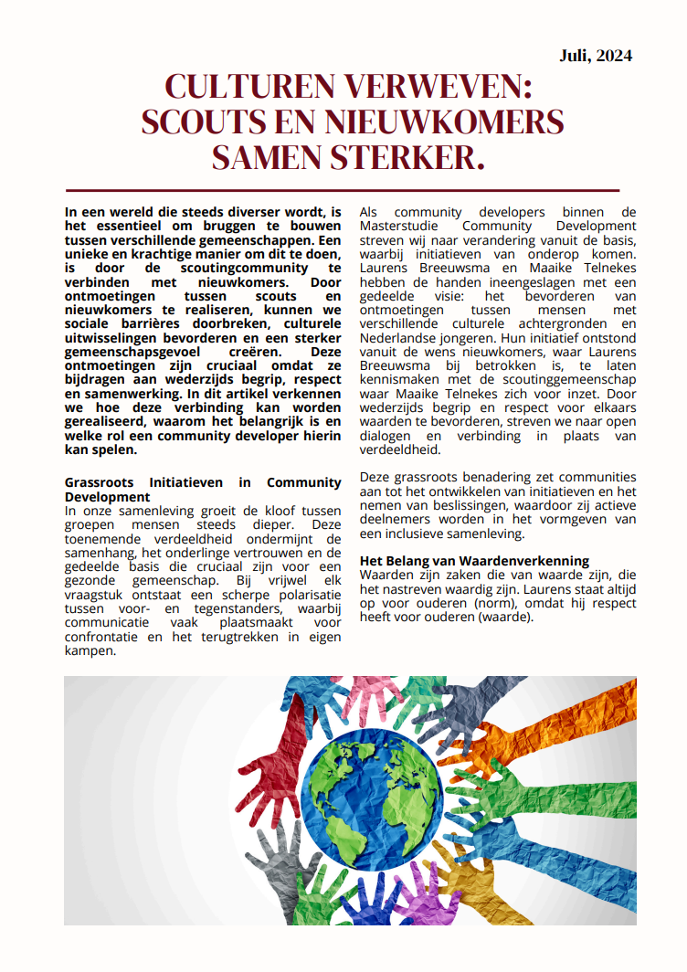 Als scouts vinden wij het belangrijk om in contact te komen met mensen uit andere culturen. We willen graag leren over hun tradities en gewoontes, en ontdekken wat we met elkaar gemeen hebben. Dit helpt ons om breder te kijken dan onze eigen omgeving en nieuwe vriendschappen te sluiten. Door samen activiteiten te doen en ervaringen te delen, groeien we als groep en leren we elkaar beter te begrijpen.