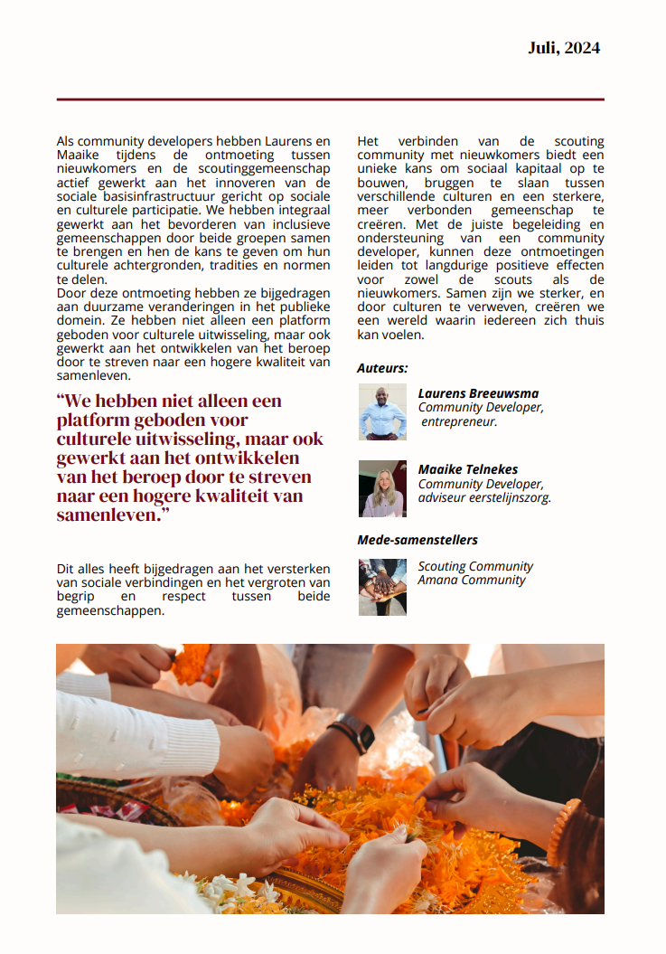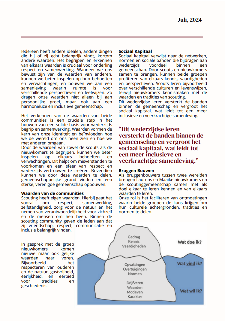 Het ontmoeten van mensen met verschillende achtergronden maakt ons als scouts sterker. We leren om respectvol met elkaar om te gaan en zien hoe belangrijk het is om open te staan voor anderen. Dit helpt ons niet alleen om een betere scout te zijn, maar ook om beter om te gaan met anderen in het dagelijks leven. Voor ons gaat scouting niet alleen om avontuur in de natuur, maar ook om het avontuur van nieuwe mensen en culturen leren kennen.
